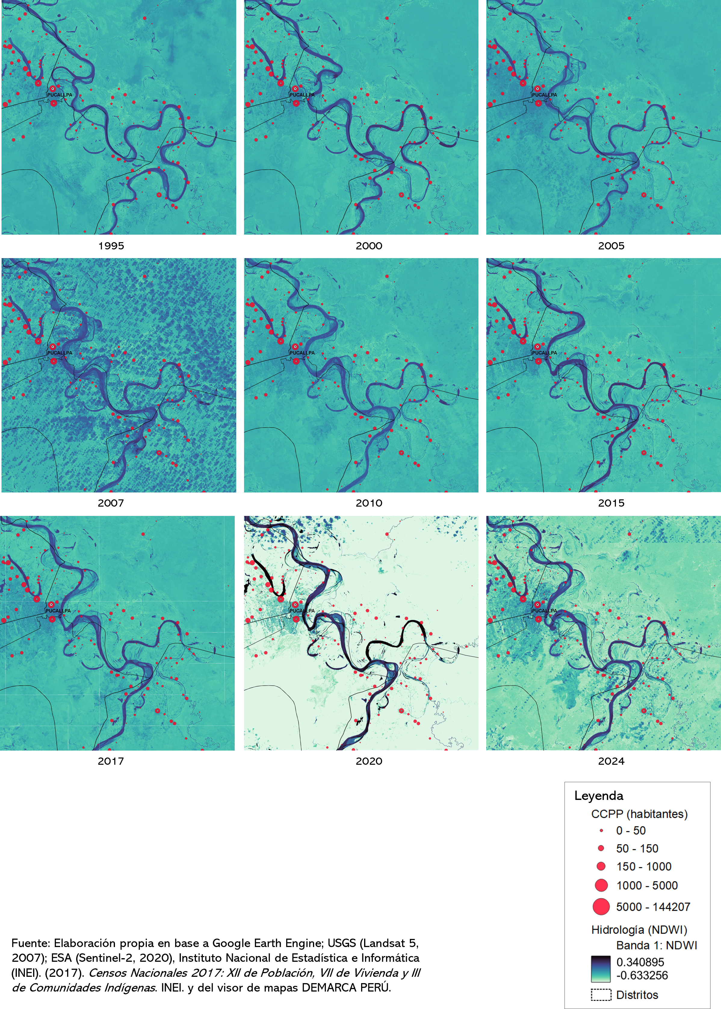 Para ilustrarlo, se realizó un ejercicio simple en la selva baja, el departamento de Ucayali:  se cruzó la ubicación de los centros poblados con el comportamiento histórico de los ríos, usando imágenes satelitales que muestran las capas hidrográficas en distintos años a partir del Índice Normalizado de Diferencia de Agua (NDWI, por sus siglas en inglés). Esta comparación permite observar los cambios históricos: la posible movilidad ecológica y los desplazamientos humanos asociados. En este ejemplo de análisis multitemporal del río Ucayali (1995 hasta 2024), se observa que algunos centros poblados que, en el pasado estuvieron ubicados a distancias considerables del río, ahora, el punto de geolocalización se encuentra encima del río. Por lo cual, la data no refleja las dinámicas reales de desplazamiento de los centros poblados.